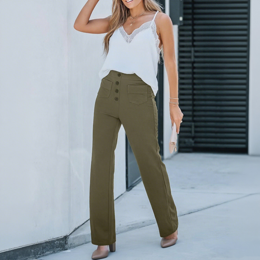 High Waisted Button Multiple Pockets Straight Leg Casual Pants